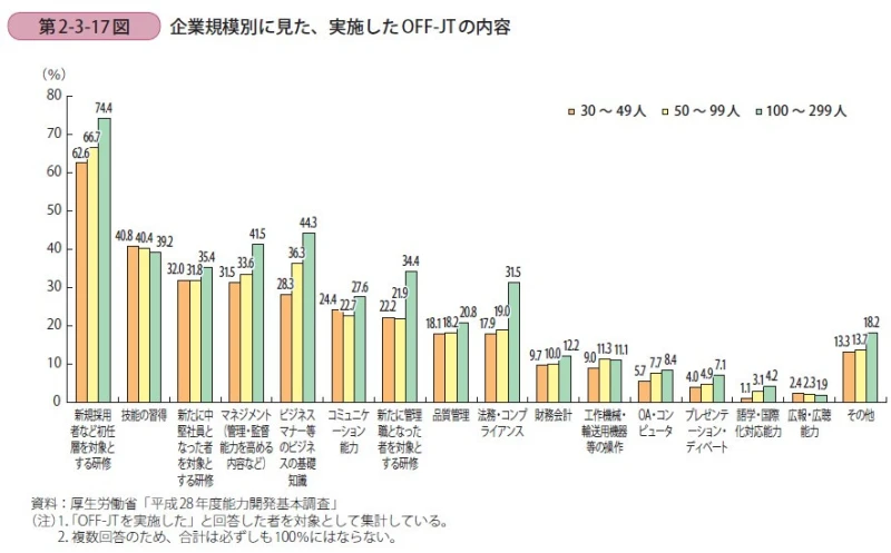 OFF−JTを回答企業割合が高いものから低いものへと並べたとき、「新規採用者など初任層を対象とする研修」「新たに中堅社員となった者を対象とする研修」「語学・国際化対応能力」となります。