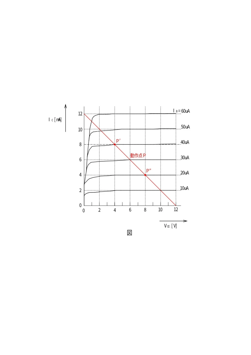 上記図は前問で求めた動作点Pを中心にしてベース電流IB=40μAの時の動作点P´とIB=20μAの時の動作点P´´を結んだ負荷線となります。