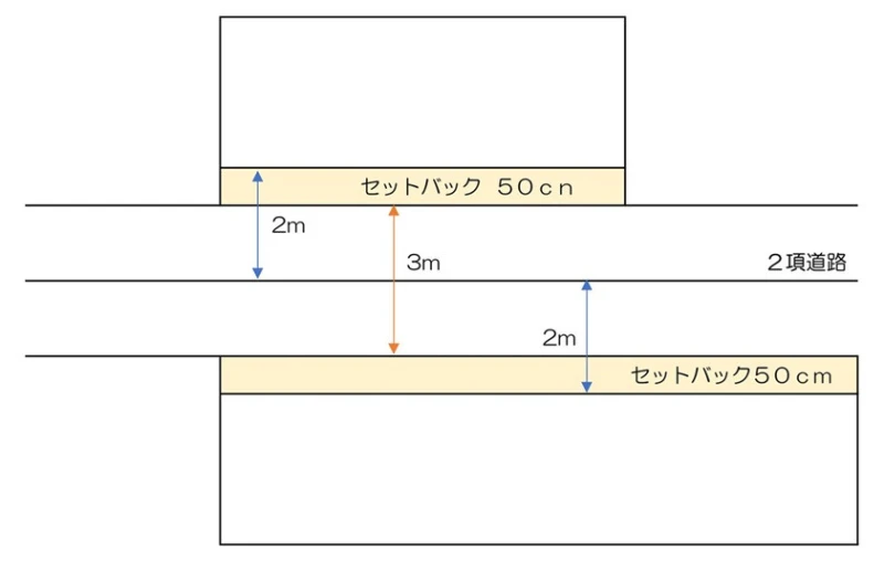 この2項道路部分に新たに家を建てるなどする場合は、道路の中心線から2mずつ水平に後退した線を境界線としなければなりません。