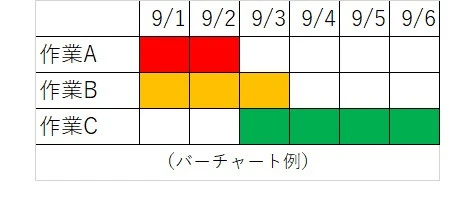 バーチャート工程表は縦に作業名を書き、横を月や日付などの工期とし、各作業の実施予定を棒グラフで表したものです。