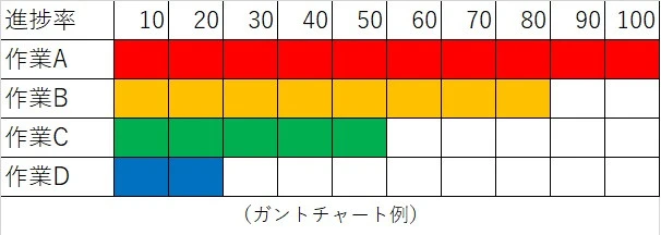 ガントチャート工程表は縦に作業名を書き、横を各作業の達成率とし、現在の進行状態を棒グラフで表したものです。