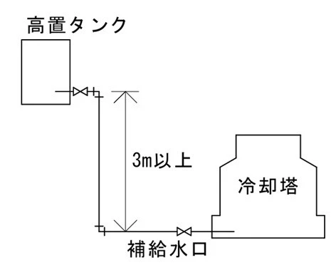 冷却塔は補給水口が高置タンクの低水位より3m以上低くなるように据え付けます。